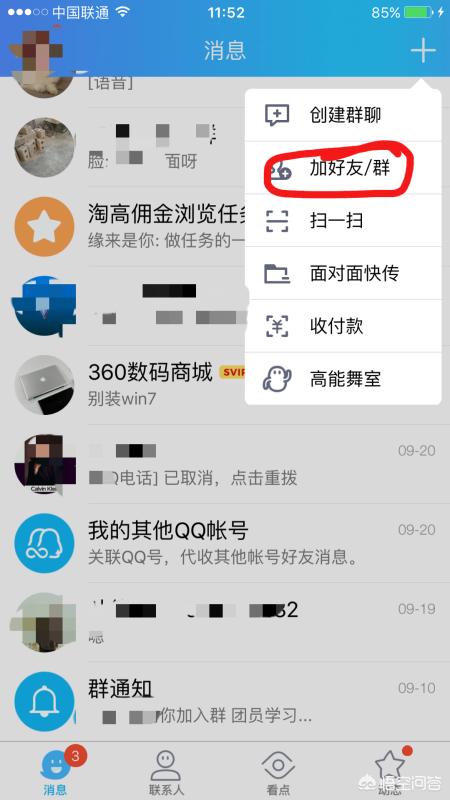 2、选择了“+”号后,选择第二个选项“加好友/加群”,点击进入即可。