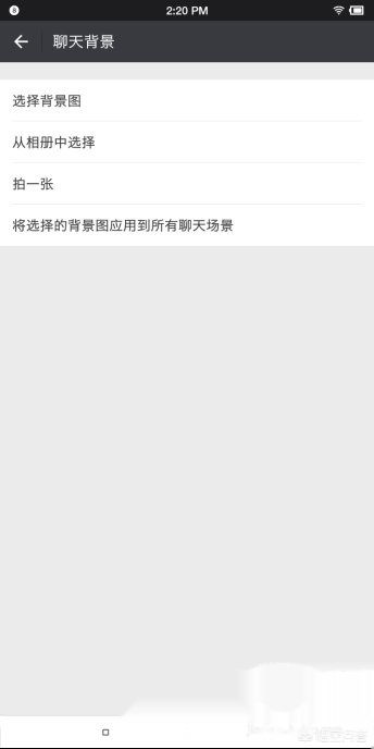 3、在聊天背景页面可以点选择背景图,使用系统中的背景,也可以从手机相册中选择你的图片作为聊天背景,这样所有的聊天背景就更改好啦!