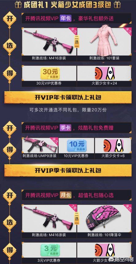 1、购买腾讯VIP年卡(233元)可获得M416皮肤或101粉色套装。
