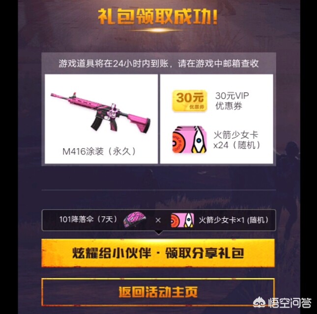 3、购买腾讯VIP月卡(25元)可获得7天M416皮肤或101降落伞皮肤。