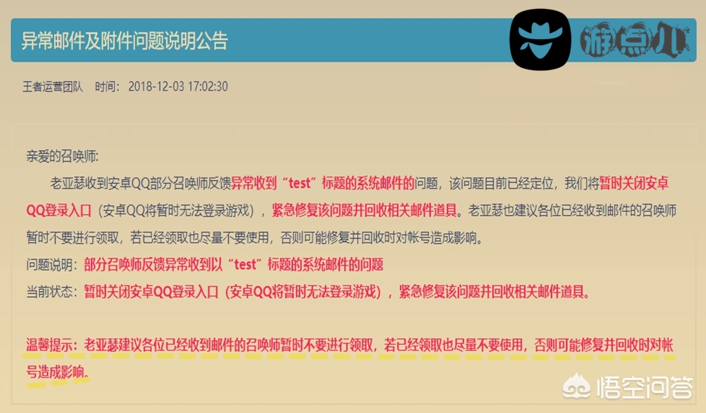 同时,点点君也找到了官网的公告,公告显示安卓QQ服务器出现了异常问题,所以暂时关闭了安卓QQ的登录入口,安卓QQ将无法登录游戏,处理办法是紧急修复这个问题,并回收相关邮件道具,也就是修复完成上线之后,邮件内将不会再有这些福利。