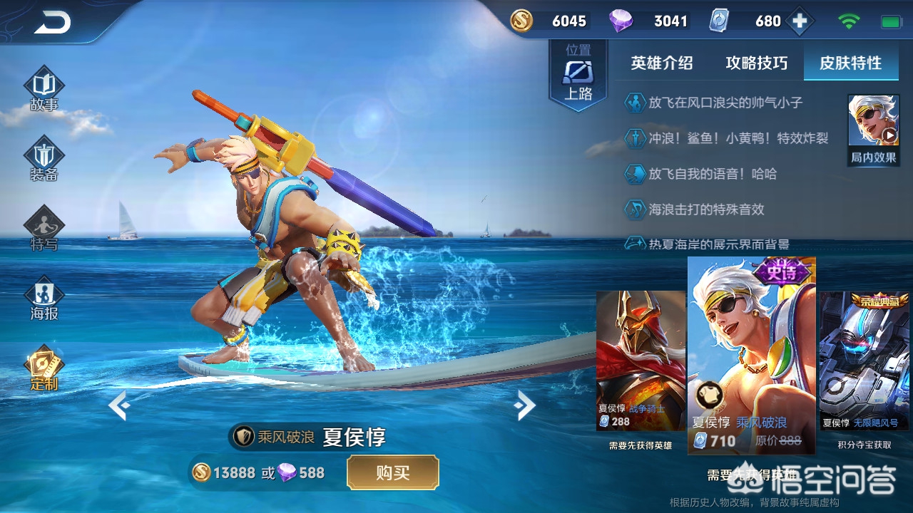在27号的更新中,就上架了夏侯惇乘风波浪(皮肤商城即可兑换)的五款星元皮肤,分别为夏海之宝藏,橘花夏威夷,速度与鲨鱼,骇浪狂鲨,夏天。