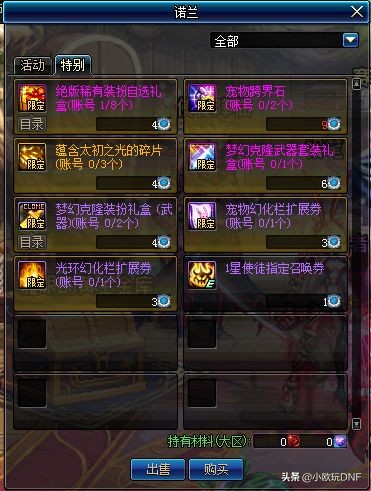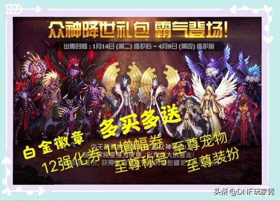先来分析一下多买多送活动,10套一轮奖励,可以购买3轮,比较有亮点的奖励是“4套梦想白金徽章”,“7套12强化券或者11增幅券自选”,“8套至尊称号”,“9套至尊鬼剑士装扮”,“10套至尊宠物”,其中,称号和宠物的提示,堪称“圈钱”重点,加入了“力量/智力10-12%”的新词条,想提示就必须买。