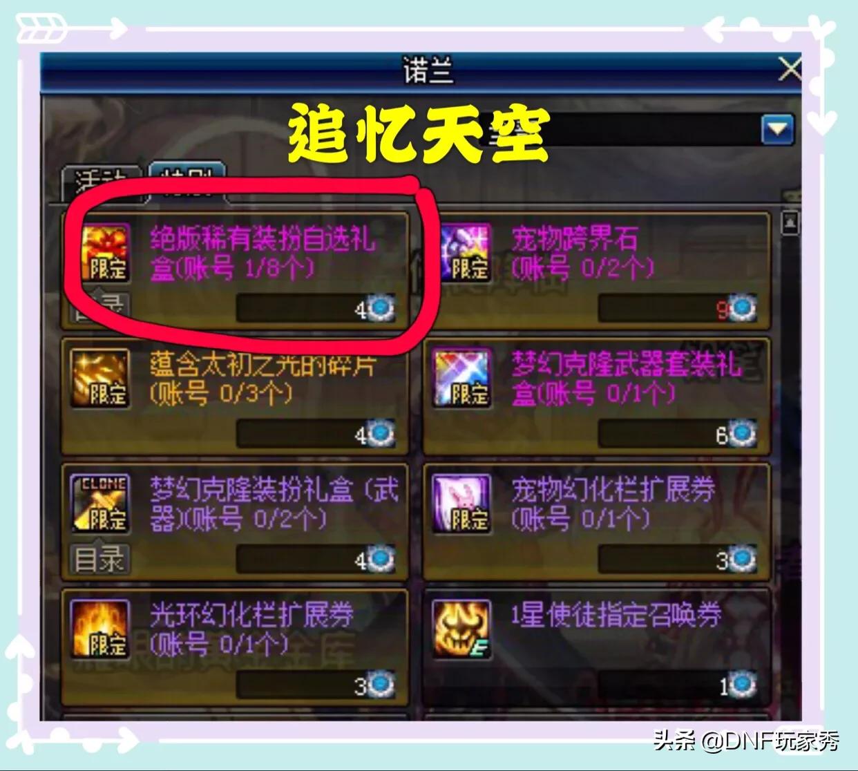 再来分析一下“春节花篮”的兑换,购买一套春节礼包,获得3个活动材料,然后,获得材料,可以兑换众多道具,其中就有4个材料兑换的追忆天空,上限8个;还有9个材料兑换的宠物跨界,上限2个,4个材料兑换的“普雷装备随机罐子”,上限3个,6个材料兑换的梦幻克隆武器装扮等其余奖励。