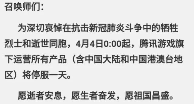 国务院号召在4月4日10点时刻起,全国人民默哀3分钟,汽车、火车、舰船鸣笛,防空警报鸣响。同时,腾讯游戏也官宣旗下所有游戏从4月4日0点起停服一天,具体的停服时间为0点-24点。