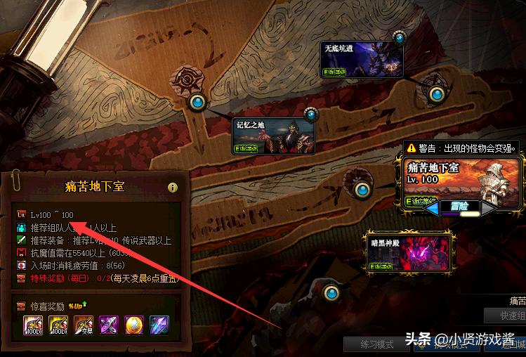 因为100版本有很多副本,而且每个副本都有不同的作用,就像痛苦地下室和暗黑神殿一样,这两个副本我们是可以刷一下的,毕竟不要门票,难度吧算是一般吧,我们可以打普通,爆率一样,冒险的话难度还是比较大的,打造不好的就不推荐冒险了,如果你找不到副本,你可以直接用米娅通讯器或者瞬间移动药剂移动得到比拉谢尔号,点击蓝色的大电视机,就看到了。