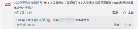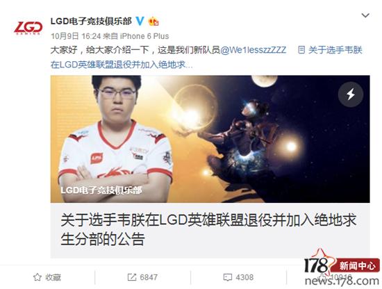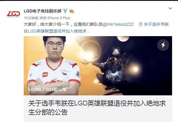 10月9日,LGD电子竞技俱乐部官微发布公告,单方面宣布韦神We1less(现已改名韦神_GODV)在LGD《英雄联盟》退役并加入《绝地求生》分部,但韦神本人却没有相应的回应。