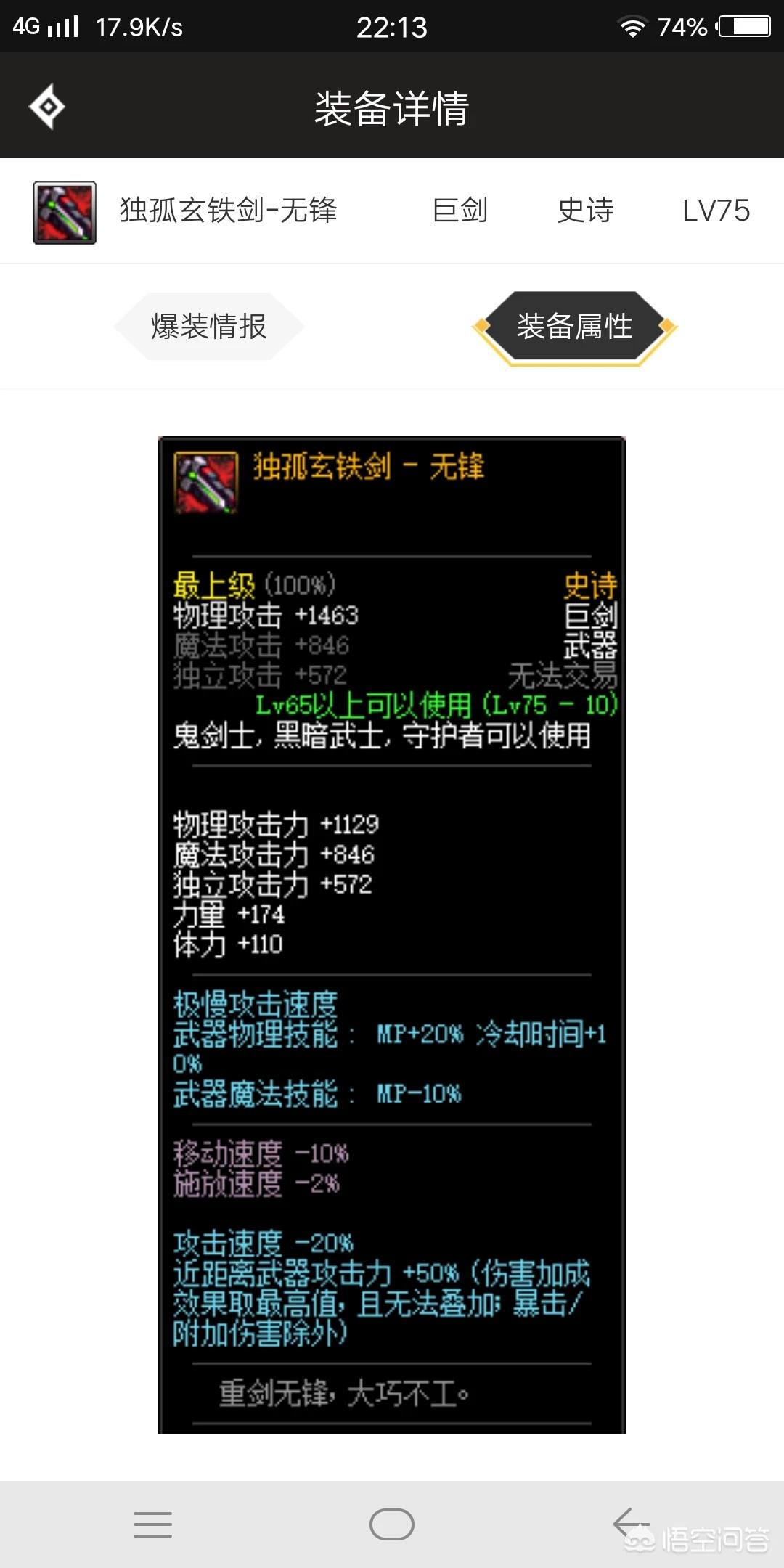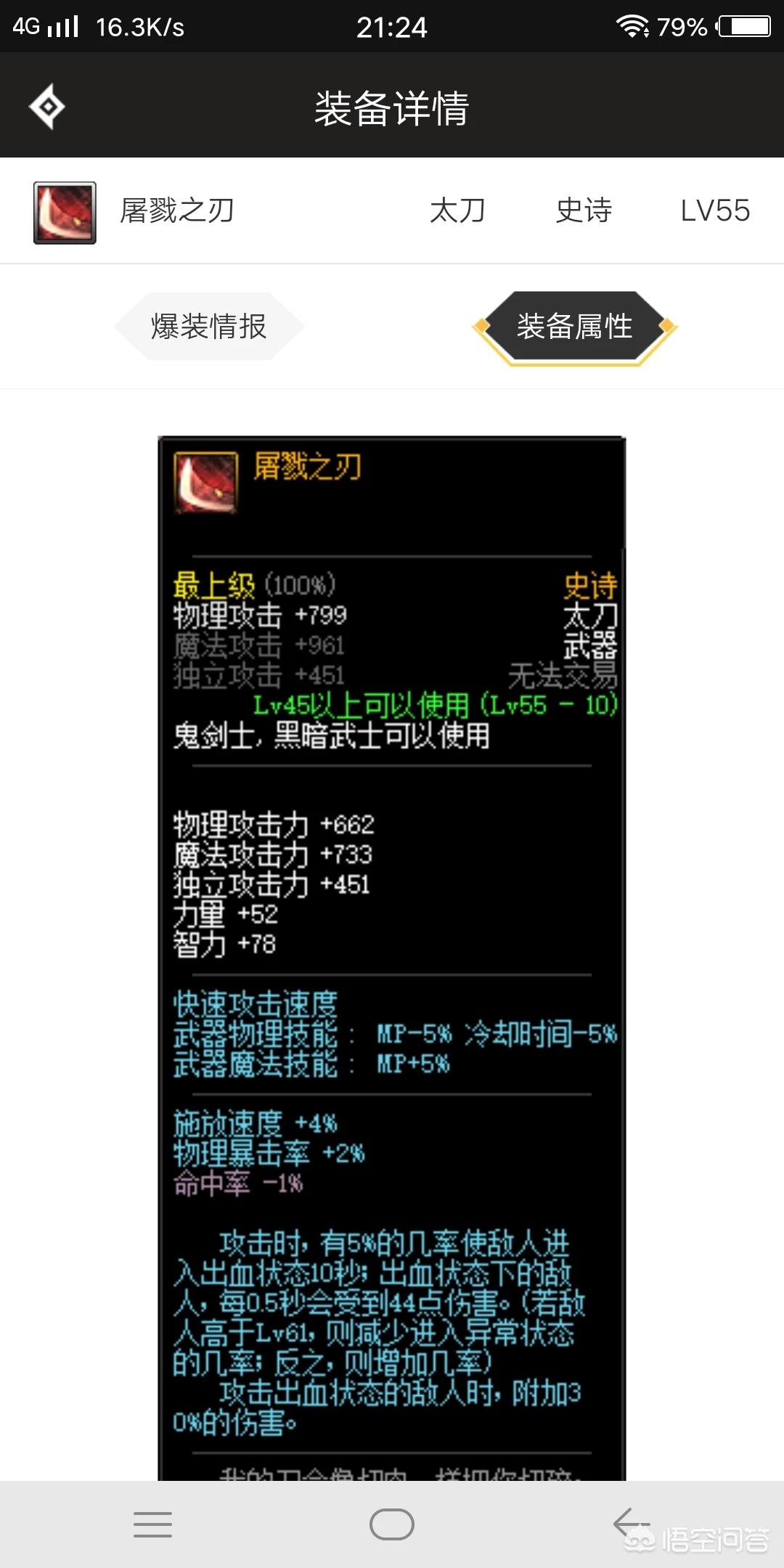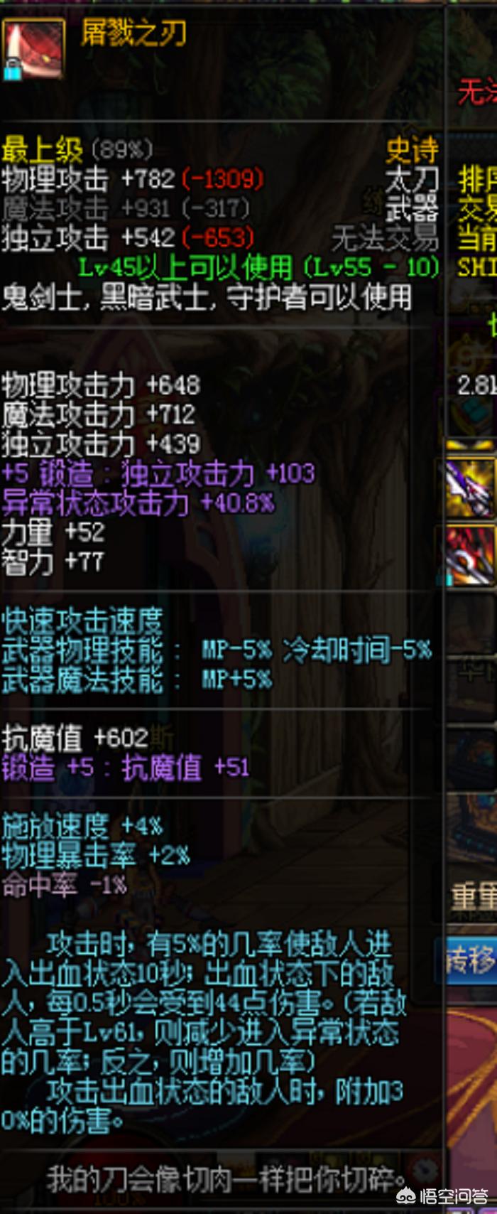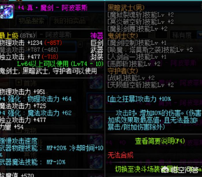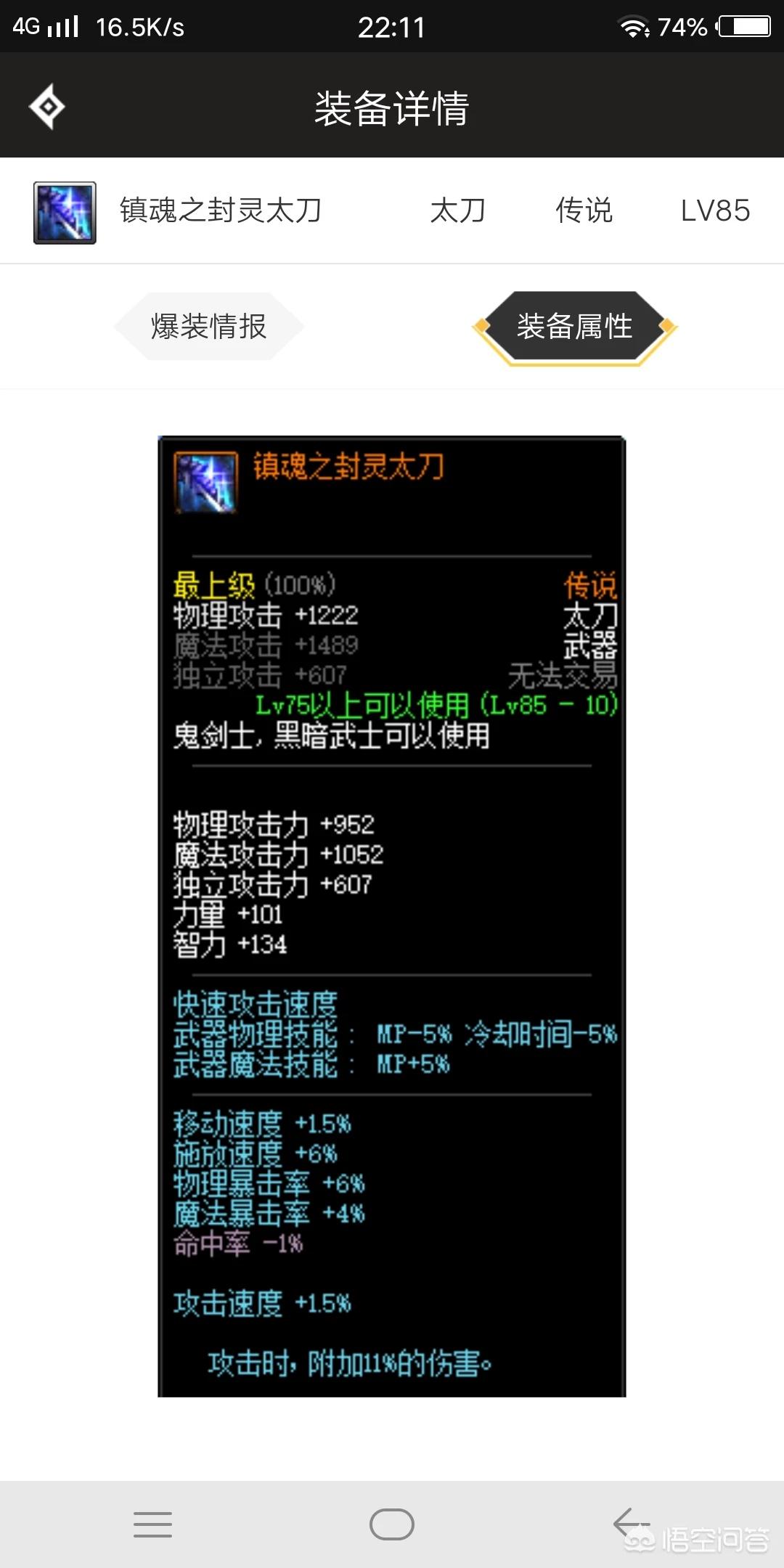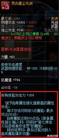 好了,以上扯淡的话你肯定看得出来,说正经的。这把武器附加了25%的暗属性伤害,而且暗属性强化到120以上魔法攻击+16%。现在的版本属强堆到120就跟喝水一样容易,单看这把武器的属性,可以说完爆荒古。但也有个比较烦的缺点,带上这把武器会十分的缺蓝,刷图时需要时不时的嗑蓝药,不然,掉的就是血了,现在才明白这把武器如果剥离不到别人的灵魂,就会剥离主人的灵魂。