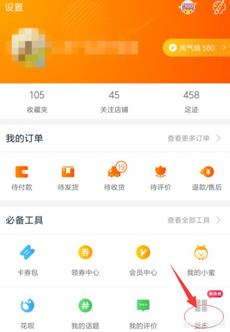 2、在我的淘宝页面中,找到必备工具栏,如图所示,点击其“更多”按钮。