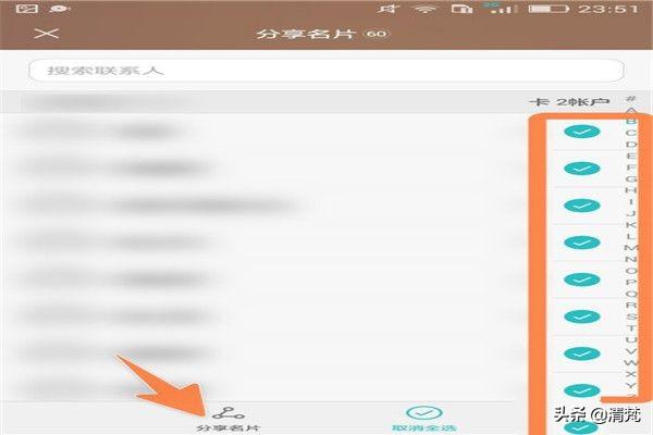 如果是选择分享名片的方式转出手机里的电话号码,那么再在打开的页面上,选好要导出的电话号码,再点分享名片。