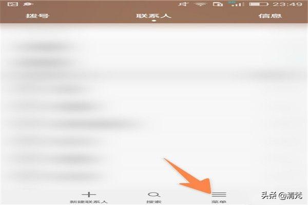 如下图,在这个手机上先点击拨打电话那个按钮,再点击联系人,然后点菜单。