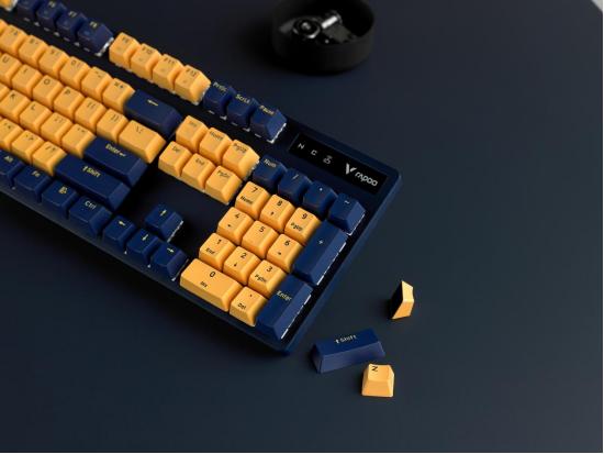 阳光活力的明黄与睿智深邃的深蓝,交错展现,如耀眼青春,令人一眼难忘。蓝牙5.0/3.0/无线2.4G和有线4种连接模式,适配范围广。可同时连接5台设备,快速切换使用,化身多面能手。搭载雷柏自主黑/青/茶/红轴,多种手感体验,品质稳定,灵动应对!