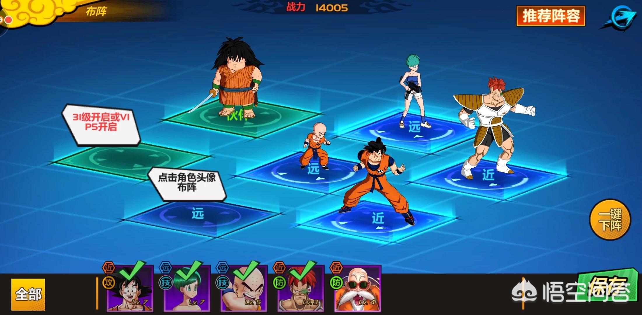 开局,玩家要想生存的更久一些,就老老实实用系统送的龟仙人和悟空最前排,中间的给库林。