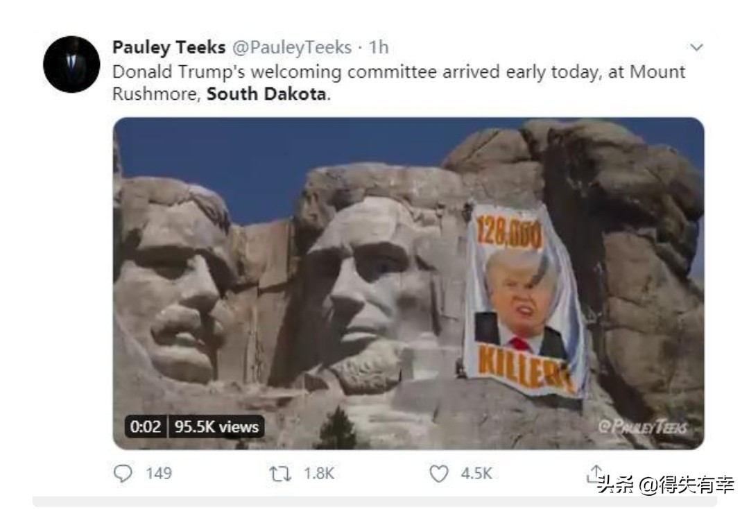 拉什莫尔山国家纪念公园的总统山上,出现了有特朗普头像的标语,上面写着:“12.8万人,凶手!”