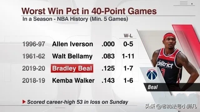 比尔没有在个人数据和球队的战绩上做好平衡,很可惜。本赛季比尔真的是把奇才扛到身上往前走,实在是太难为他了,他目前有点科比一个人带队时候的感觉,自己一个人上天入地翻江倒海,可是球队却一塌糊涂。