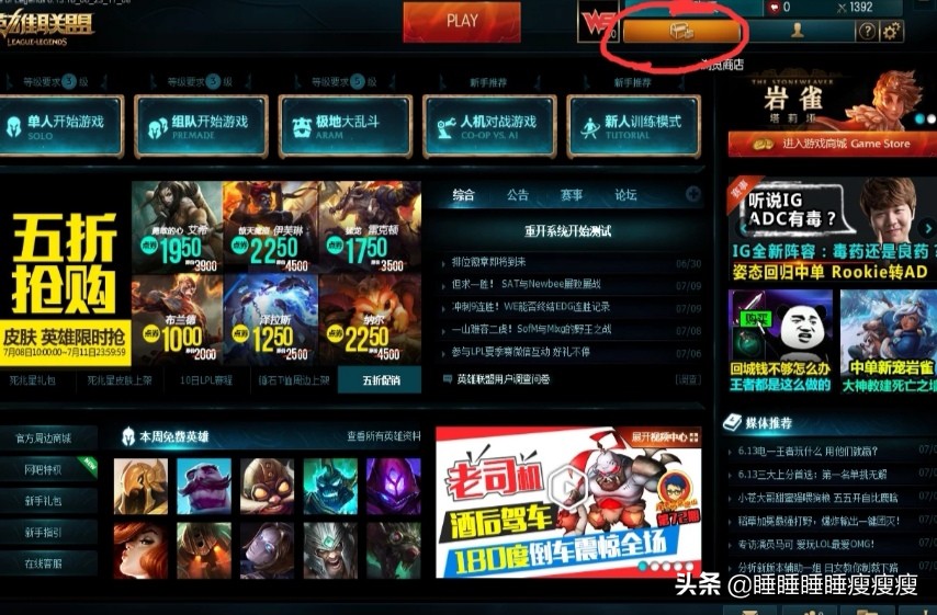 1、进入lol的新版客户端,点击右上角的商城按钮。