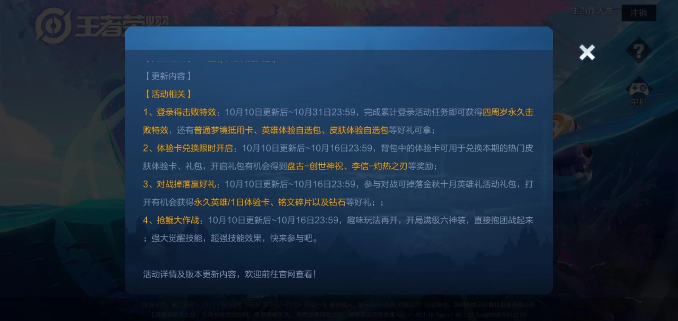 3、对战掉落赢好礼: 10月10日更新后~ 10月16日23:59, 参与对战可掉落金秋十月英雄礼活动礼包,打开有机会获得永久英雄/1日体验卡、铭文碎片以及钻石等好礼; ;
