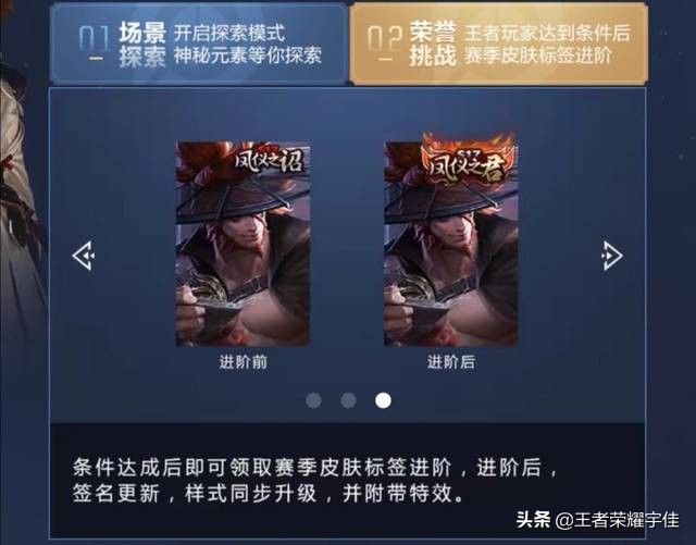 然后就是对于一些变化,第一个变化就是赛季皮肤标签可以进阶的,进阶以后主要就是会有新的特效,还有就是签名也会发生变化啦,所以说,唯一的限制条件就是需要王者段位以上,达到这个到位,你还需要完成相应的任务。