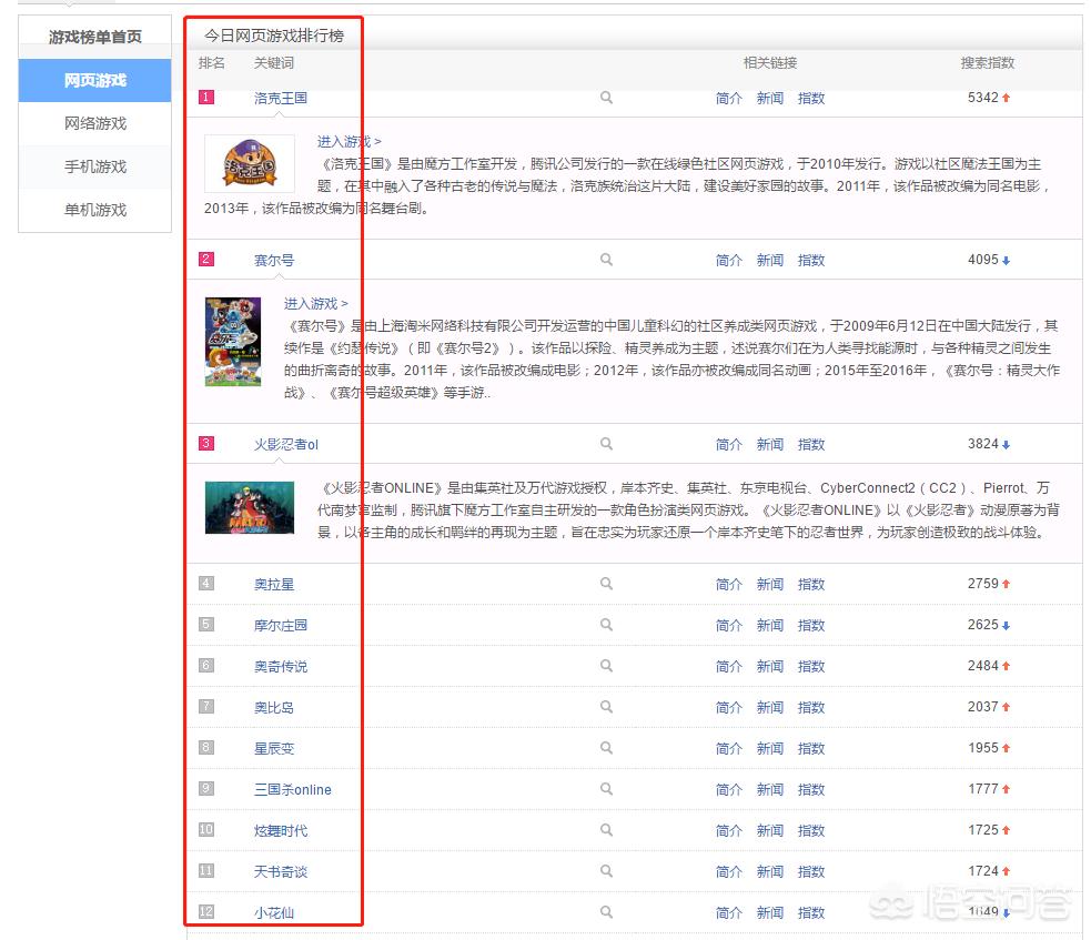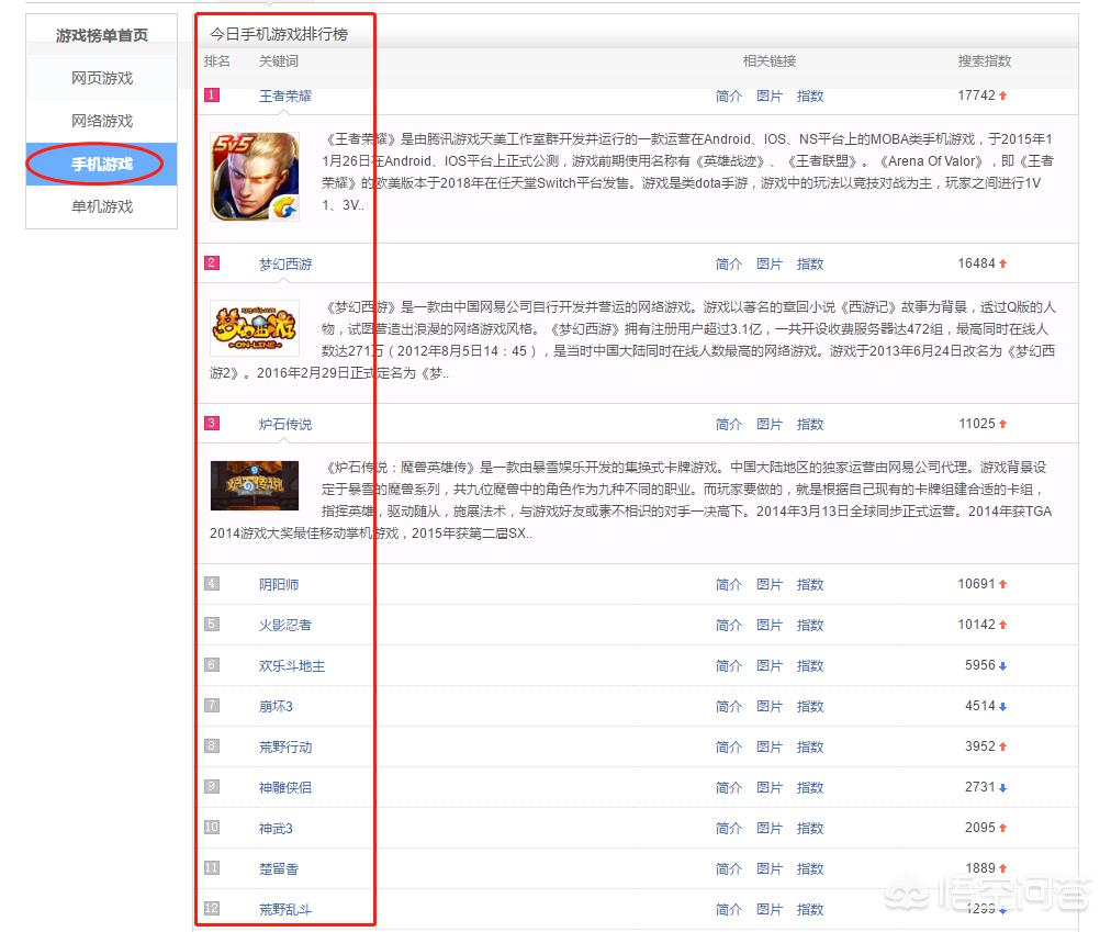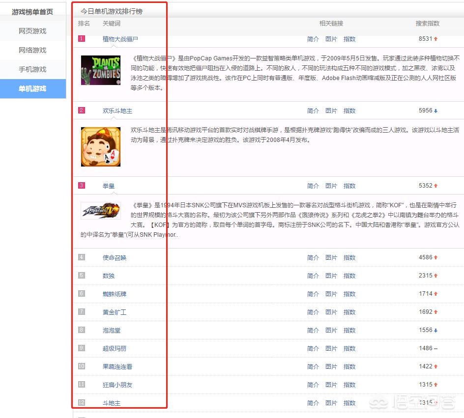 对于游戏主要分为以下几类,网页游戏,网络游戏,手机游戏,单机游戏。根据百度搜索风云榜最新数据显示,排名靠前的游戏主要有下面图片所示的内容。这个数据具有一定的说服力。供你参考。