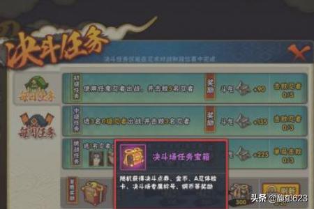 6、【决斗任务】目前有决斗场首胜宝箱,每天决斗第一次获胜有金币、点券、随机A/B/C忍者碎片奖励;决斗场任务宝箱是决斗随机获得的,也是有点券、金币、铜币、称号、忍者碎片等奖励的。