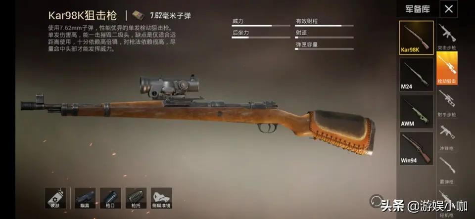 接下来:再来说说自从刺激战场时期,就已经存在的”枪械元老“98K;这把枪使用7.62毫米子弹,拥有着五发的载弹量,一句话:用的好的人,枪枪爆头乃家常便饭,反过来说:用不好的人都是人体描边。