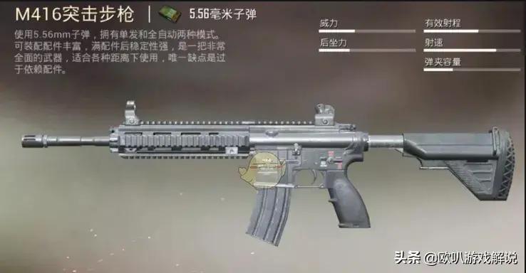 首先来说说M416(现实中叫HK416)是德国HK公司生产的一款突击步枪,在游戏中使用5.56毫米子弹,最远有效射程;400米,无论是当做狙击枪(调成单发模式)远距离偷袭,还是当做步枪,近距离硬钢,都是不错的选择,特别配件要求(战术枪托)只要有了这个配件,那你们大家就可以放心使用了,因为:只要有了枪托,这把枪就可以碾压一切,无论是:红点、全息、二倍、四倍、六倍、甚至是:刺激战场初期的八倍,统统没问题,简而言之就是:压枪稳如泰山。
