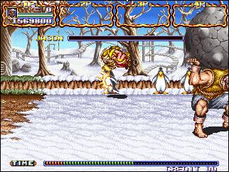 这个游戏当年大江南北的街机厅都有,分布在全国各地,可是一提起这个游戏,不管哪里的玩家都知道里面的一些诀窍,比如跳起来落地之前的瞬间按AB,我已经忘了跟谁学的了,但好像大家公认的都会,还有神奇的马蜂窝,大家都知道如何有效的使用,一下子可以把boss砸到残血,还有对付一些BOSS时候用的无限连,那时候叫吸住,比如冰锥那一关的BOSS可以用小孩子一直有节奏的平A吸死,一些操作上的细节也不知道怎么传播开的,那个时候可没有网络的。