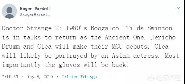 根据翻译,图片上的内容是:《奇异博士2》20世纪80年代的Boogaloo(是一种实感很强的街舞,大概就是形容逼格很高)。蒂尔达·斯文顿正在协商以古一身份回归。巫毒医生和克莉将首次亮相MCU,克莉很可能由一位亚洲女演员饰演。最重要的是无限手套会回来的!