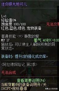 迷你银光妲可而并非是玩家所想象的蛇皮属性,而是一个具有强化功能的宠物,在强化装备时,可提升2的强化几率,不过却让人呢感到意外的是居然没打%号,这也就是说迷你银光妲可而极有可能是DNF第一个强化装备加算的宠物,不过也有可能是临时工把%号给忘记打了,毕竟现在还没在正式服登录。