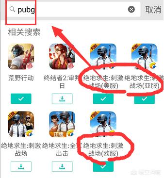 搜索界面输入PUBG,就可以在结果界面看到有3个版本的国际服可以下载,如下图所示