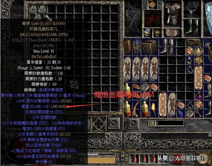 悔恨最强大都地方就是最高可以直接增加400的伤害,他的这个伤害是直接增加在武器最大值和最小值两端的,比如幻化之刃的基础伤害是31—35,增加400后就变成了431—435,这个数值是要高过很多双手武器的,因为数值在面板不显示,所以很多新人看到那么一点点伤害还以为自己上当了。