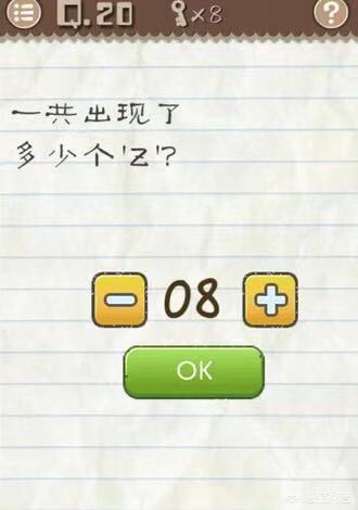 至于游戏的第20关,其实很简单,要跳出常规思维逻辑,问题问到一共出现了多少个‘Z’?看完动画后,数一下有多少个Z,然后再加上题目中的Z,就是题目的答案,具体的数值是不固定的,只要动画中的Z数完后再加1就是答案了。