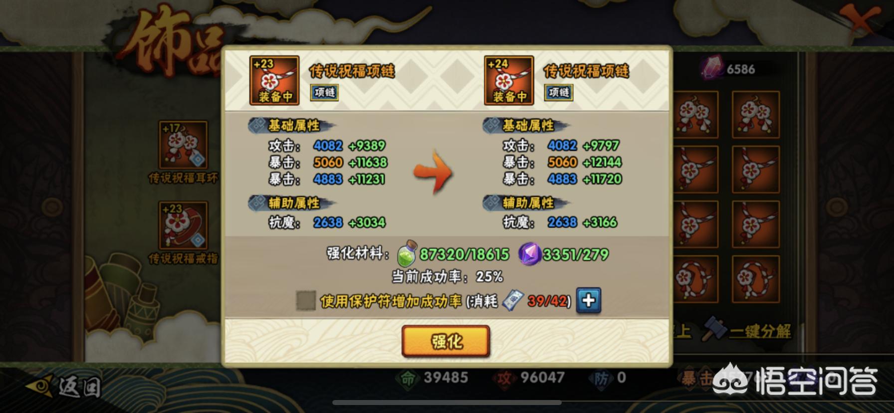 但是,想要稳定的获取到传说祝福饰品,还是需要提升抗魔,因为只有抗魔值达到25600+以后才能够在要塞等活动里领取到随机传说祝福饰品,而现在又回到了强化饰品方面,因为强化的概率有时候真的可以忽略,50%以上的成功率都能够连续失败几次,所以这个对于平民玩家来说只能靠运气来强化,土豪是直接保护符一路上去。