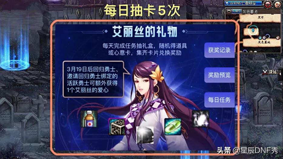 玩家每天通过“登陆游戏”,“通关2次推荐图”,“点赞一条资讯”,“点赞一个动态”,“分享活动”这5个任务,累计可以获得5次抽卡机会,随机获取“1点疲劳药水”,“1个品级调整箱”,“1天黑钻”,“5%经验胶囊”,心意卡等8种道具中随机获取一个。其中,5%经验胶囊可以在95-98级使用,可以为早日满级100助力。