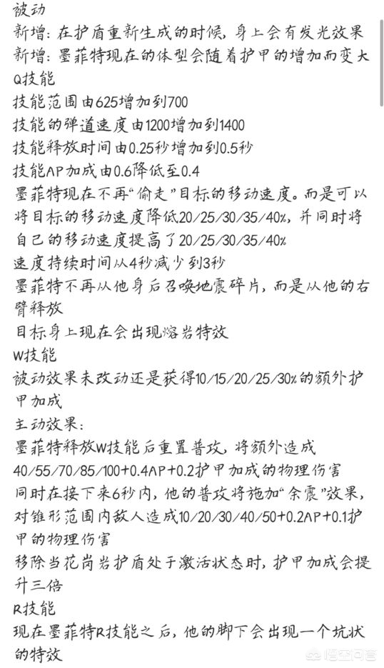 接下来说说技能的小重做,Q技能范围加长,弹道加快。AP加成降低,彗星流的AP石头人进一步削弱,让其回归不灭之握和余震的肉坦打法,总体来说线上消耗能力变得更弱了一点。一处偷取目标移速,让石头人的减速和加速更加稳定。