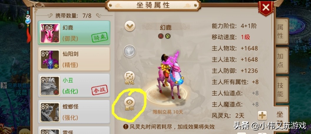 不显示坐骑之后,我们再一次点击宠物头像-坐骑-隐藏(显示)位置。