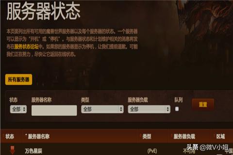 2.如果电脑已经接入网络,此时建议先打开魔兽世界的服务器状态查询页面,看看当前魔兽世界服务器是否在维护中。地址是:,在页面中可以看到所有服务器当前是否为可用状态。
