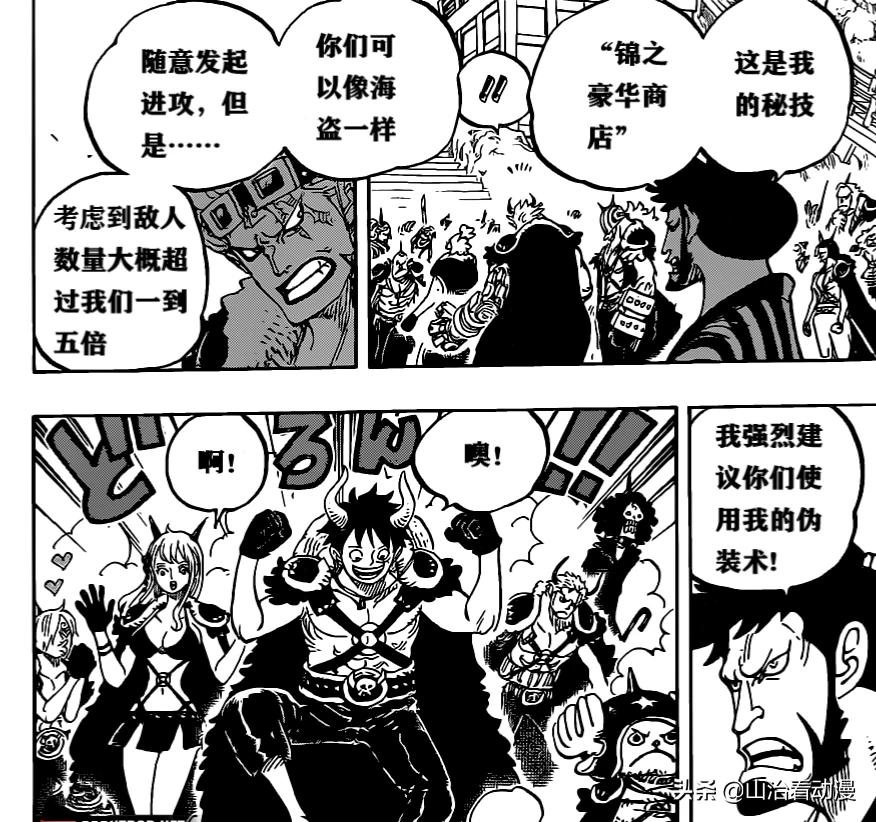他们还是发现了百兽海贼团的人,这是他们没有意料到的,锦卫门使用了伪装术,草帽一伙都穿上了百兽海贼团的衣服,路飞还是很喜欢百兽海贼团的装扮,基德并不乐意,最后还是接受了,毕竟他们不能与百兽海贼团提前开战,这样就能顺利混入鬼岛内部。娜美新装还是那么美丽,只是布料越来越少了。