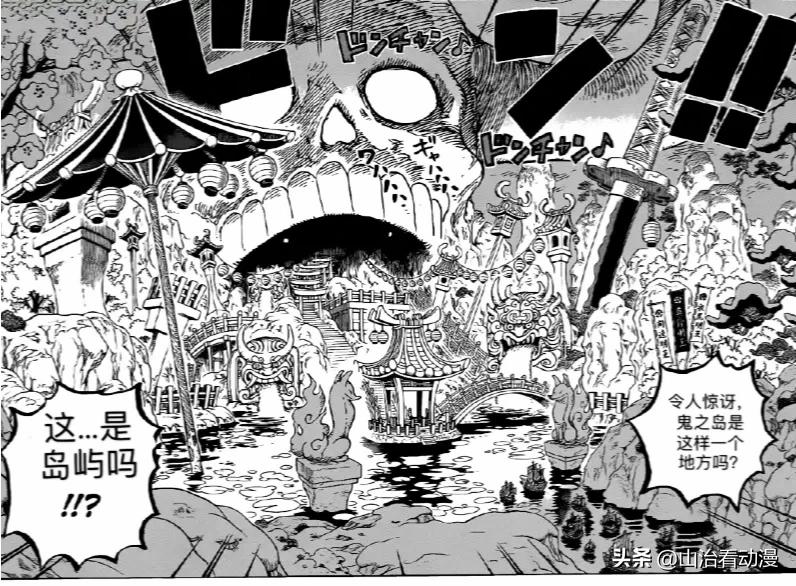 草帽一伙,赤霄九侠等武士船只已经进入登陆鬼岛,鬼岛里面的情况呈现出来了,这里的建筑还是很多的,主体建筑是骷髅头,旁边还有一把巨人族使用的名刀。他们登陆后,赤霄九侠等武士摧毁了船只,路飞还一脸懵逼,他们为何要催了好好的船只,即使战胜了凯多,他们也没有船只回和之国呀!