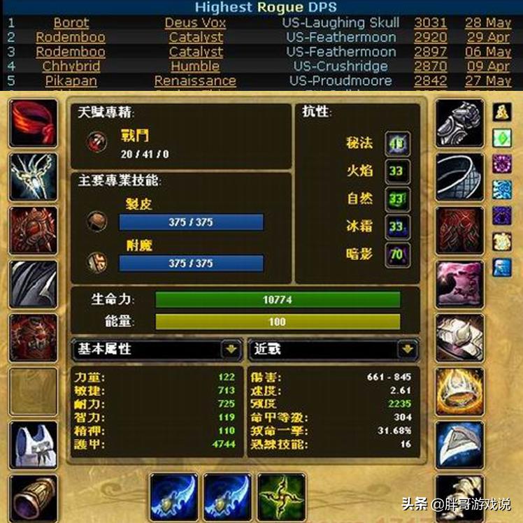 这是当年公认的世界第一公会的团队在2.43版的数据,需要注意的是前2猎人由于公会手黑一直没有橙弓,而第3的盗贼是有双刀的,当然可能脸丑了点所以没上3000,不然以这个战斗时间双刀贼应该可以过3000的,但是即使这样也不是兽王猎的对手,同等装备操作下基本也就是这个排名了,我还是那句话,怀旧服不可能开3.13版本,就像60级怀旧不会开2.0版本一样,那些3.13才入坑不去了解下就觉得我即世界的傻逼等着到时候被打脸吧,我说的意思不是3.13入坑的是傻逼,这是代理的锅我说的是那些3.13才入坑玩就觉得自己玩的才是正宗的70级跟我理论什么奥法惩戒骑才是王者的傻逼。