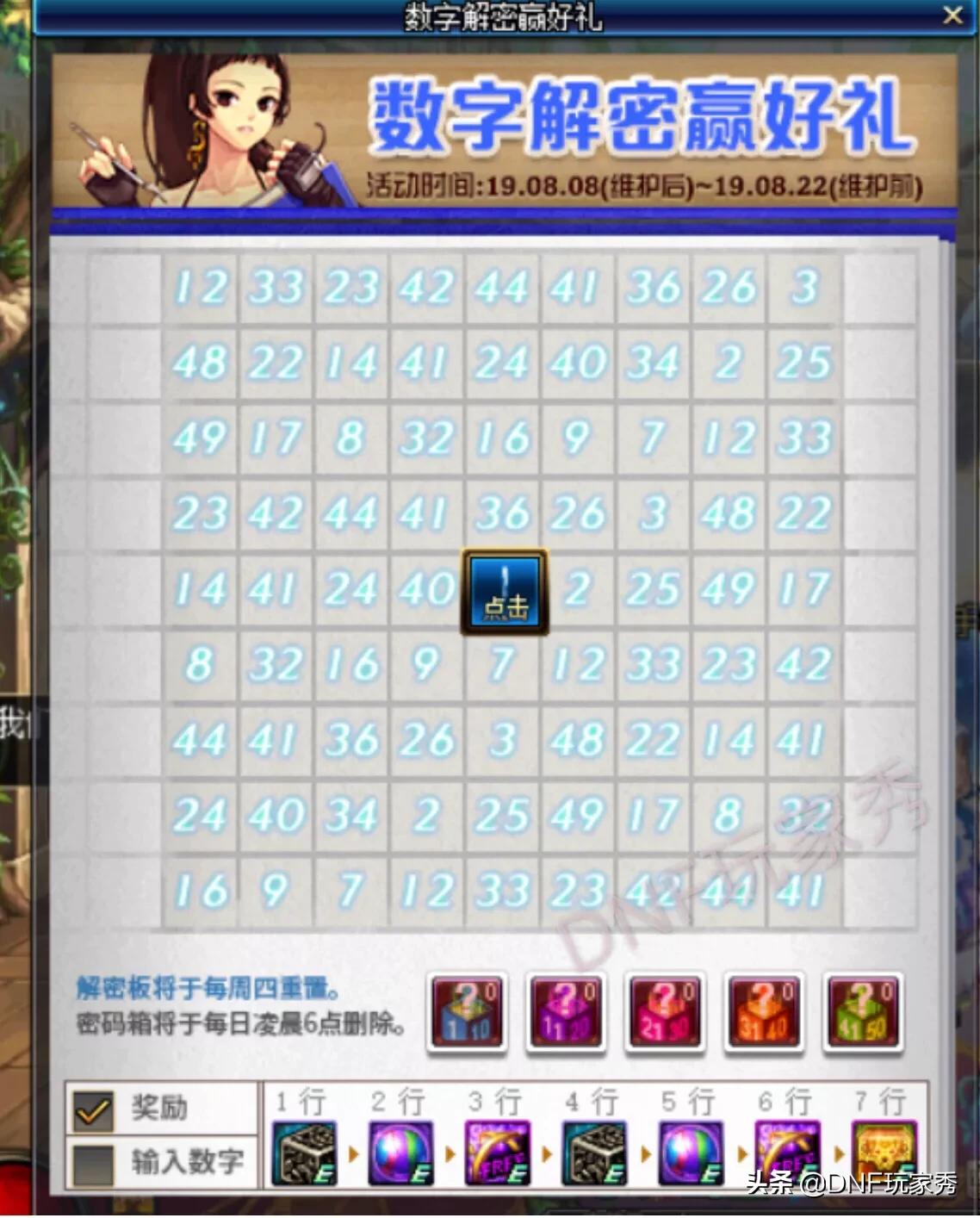 DNF将于8月8日到8月22日,上线一个“解密数字得好礼”活动,玩家刷图获得解密礼盒,开启解密礼盒获得密码箱,然后开启解密,每周更新一次!