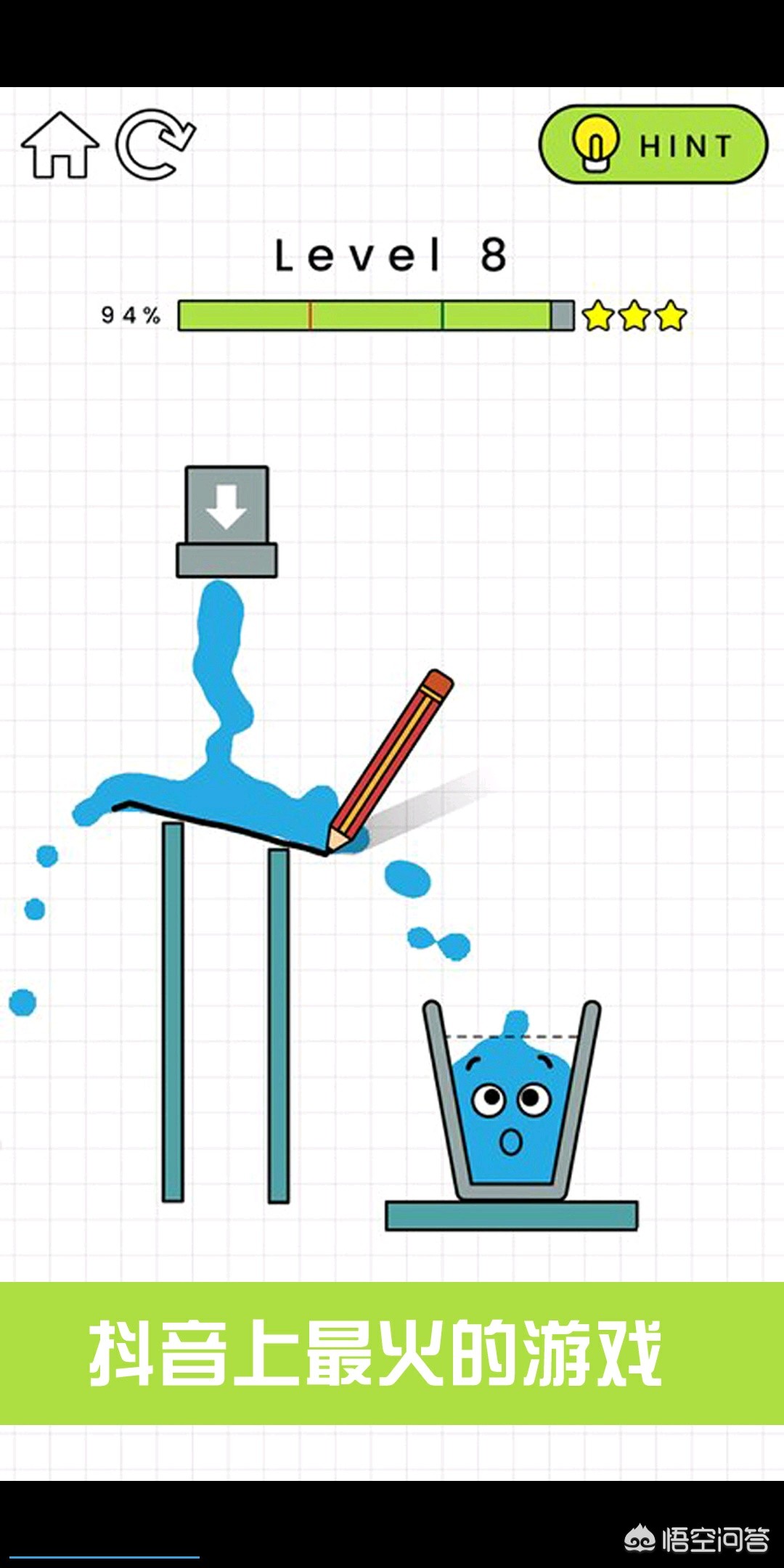 又比如《Happy Glass欢乐玻璃杯》游戏,这款游戏感觉是为了触控笔而设计的,因为用笔玩更精准简单,你只需要在屏幕上画一条线通过运用力学原理,让水到达另一个杯里面就可以通关了。