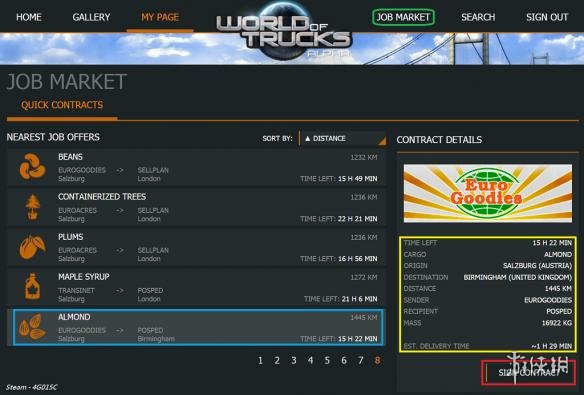 您需先将游戏内的人物连接上卡车世界,并登入 World of Trucks 卡车世界[worldoftrucks.com] 的网页。再从上方横幅点选 "JOB MARKET",首次进入需要先指定您的工作初始城市,然后在挑一个您喜欢的任务,右方会显示关于此任务的详细资讯,最后按下 "SIGN CONTRACT" 即可。
