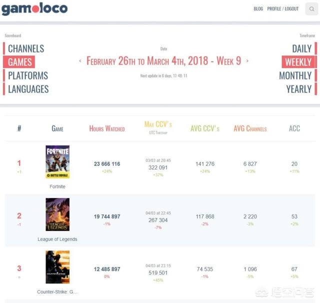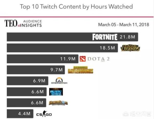 我们可以通过下面这幅图看一下,Twitch是国外知名的直播平台,通过数据统计,堡垒之夜的观看时长是最多的,而绝地求生仅排在第四位,但是在国内的情况就完全不同的,纵观几个知名的直播平台,依旧是以《绝地求生》为主,《堡垒之夜》几乎是看不到的。