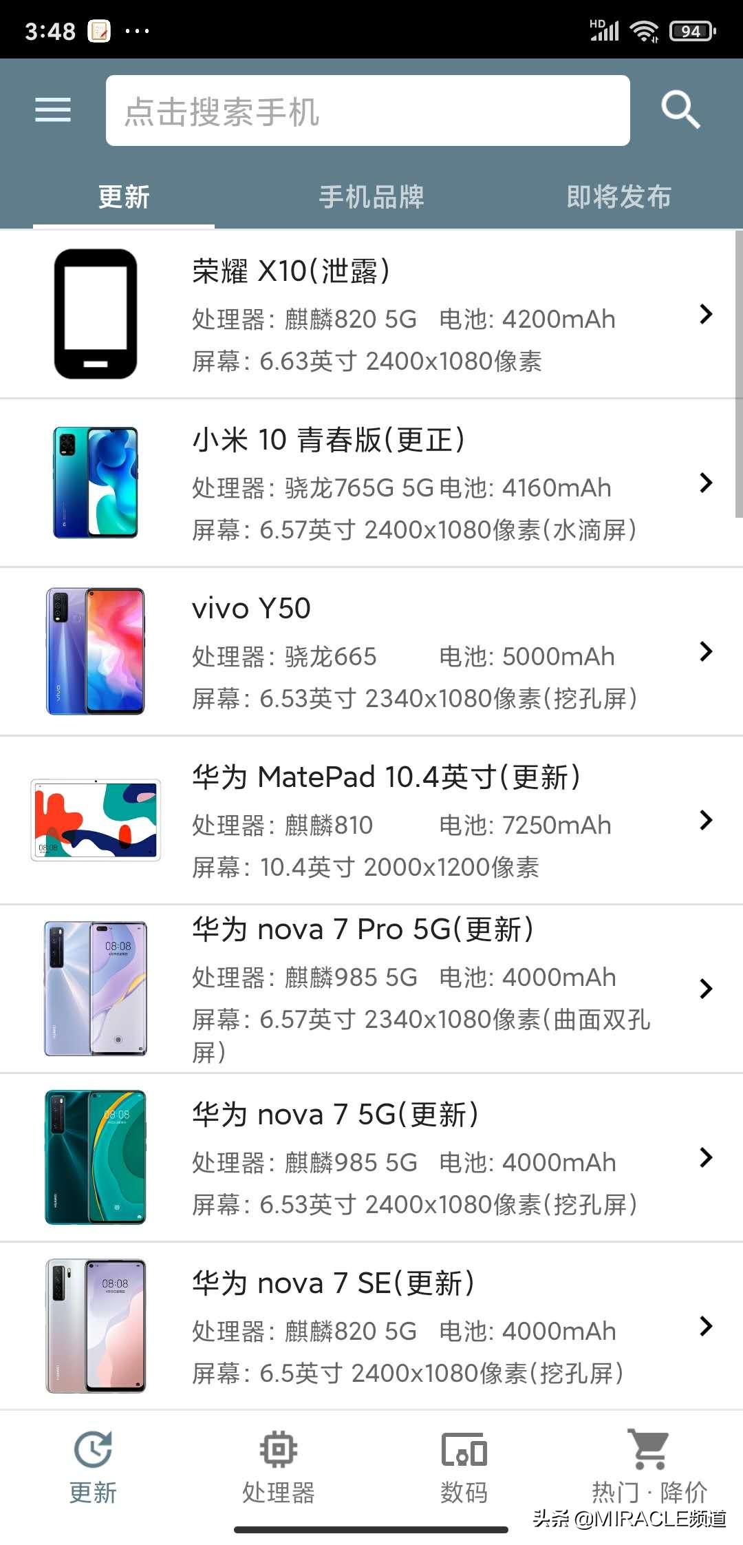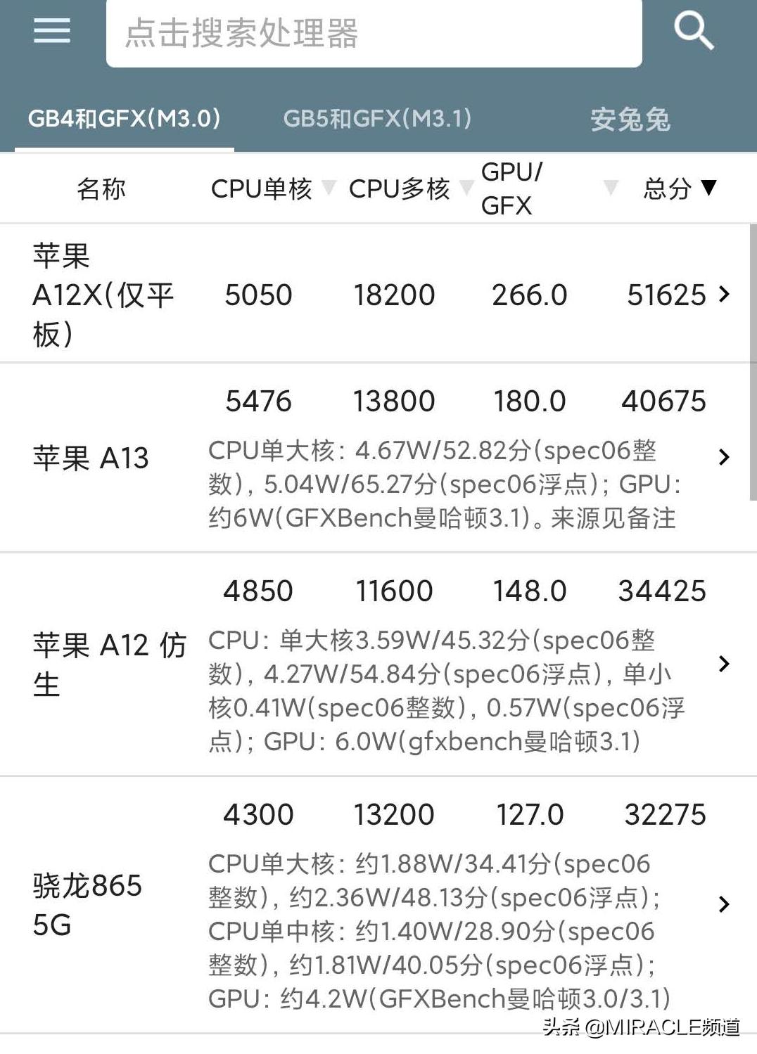 当然这不是它最牛的地方,它最牛的地方在于它有一个手机处理器的分类。它是将市面上所有的手机处理器全部汇总到这里,包括一些网上实锤的处理器,它都会进行收录。然后在每个处理器里面都有明确的跑分情况和处理器的详细参数。