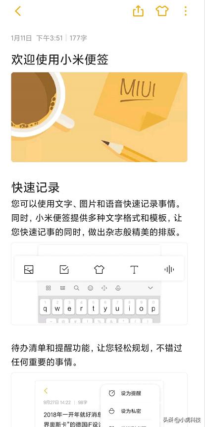 小米便签功能其实做的很实用的,不是小米手机的也可以应用商店去下载,你可以使用语音、文字、图片三种方式快速的记录一些事情。甚至你还可以用它来写作和记日记,并且还支持排版哦。这里还可以将便签设置为待办提醒。开会的时候也可以用它记笔记。
