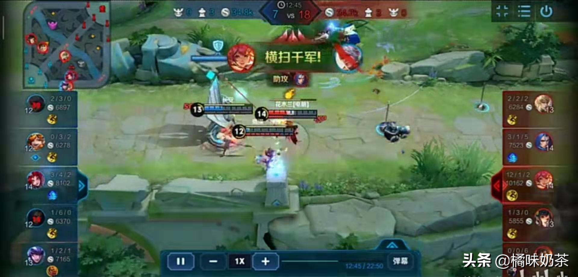 而令人惊喜的是,花木兰的操作相当熟练,技能连接都非常娴熟,令橘子比较惊艳的是,她的闪现一技能精准切掉路人玩家的两个残血英雄,在开局五分钟拿下了六个人头,同时花木兰的细节把握的也是非常好,知道重剑躲避防御塔伤害。游戏进行到12分钟,花木兰已经拿下13个人头,平均一分钟一个人头,值得一提的是,人机花木兰还会利用操作隐藏视野,用来逃生。