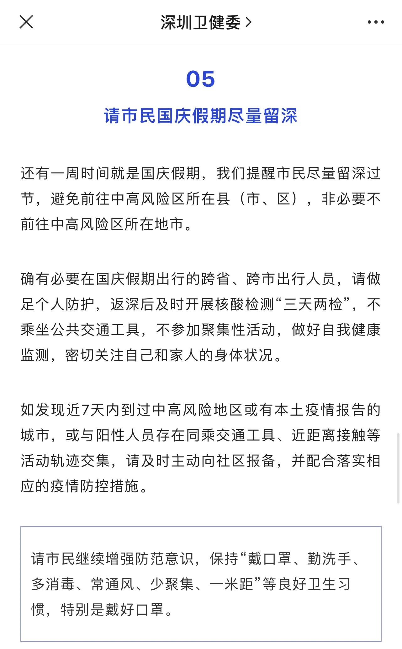 另外,政府呼吁市民国庆期间尽量留深,虽然说现在出行只要按照要求和规定,做好核酸检测,不过对于出省,还是比较麻烦。
