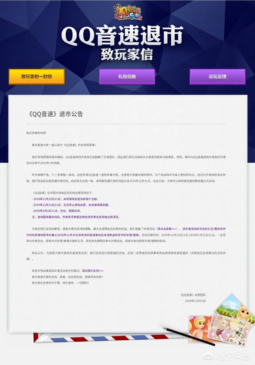 直到2018年11月22日,腾讯发布退市公告,表示游戏开发商已解散开发的团队,腾讯的代理协议也将在2019年1月到期了,运营12年的《QQ音速》已接近尽力了,腾讯也不会买下也不会续约。