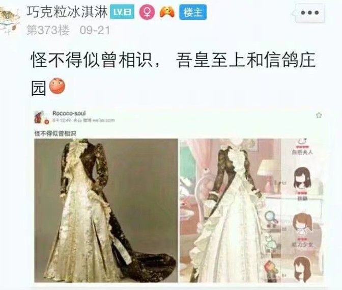 然后我又查了查资料,大约在18年的时候。奇迹暖暖又被曝“抄袭”其抄袭内容是根据一些名牌衣服甚至是油画。我看了看确实感觉挺像的,以下是图片你可以看看。对此许多网友的态度也是个不一样。